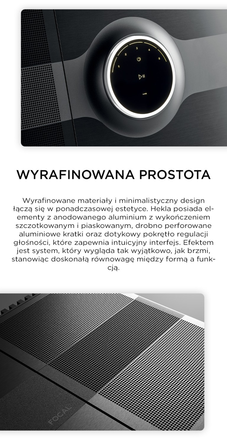 Opracowany wspólnie przez inżynierów Focal i Naim, Mu-so Hekla uosabia wspólne dążenie marek do doskonałości akustycznej. Jego precyzyjna akustyka i skrupulatnie zaprojektowana architektura łączą zaawansowaną elektronikę z całkowitym wzmocnieniem 600 W, aby napędzać dedykowane głośniki wysokotonowe, średniotonowe i woofery z wyjątkową klarownością i kontrolą. Regulowane ustawienia akustyczne umożliwiają precyzyjne dostrojenie wydajności do pomieszczenia i preferencji, zapewniając dźwięk, który jest idealnie zbalansowany dla danej przestrzeni.